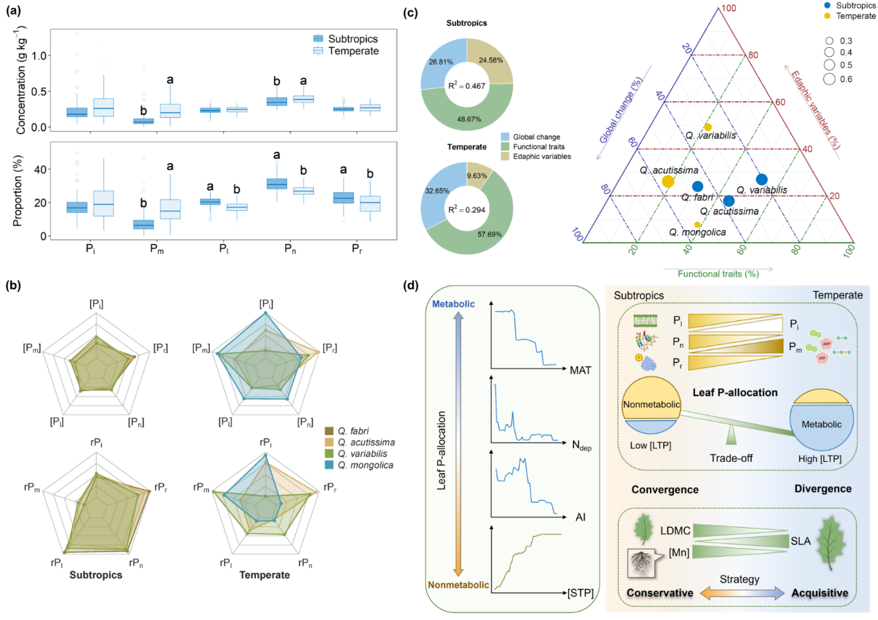 Figure. Spatial patterns and regulatory mechanisms of leaf phosphorus-allocation strategies in deciduous oaks.